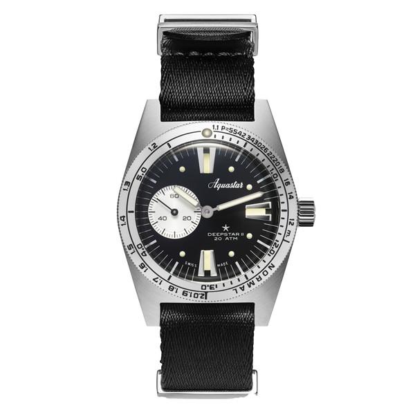The Aquastar Deepstar II is the evolution of the original Deepstar from 1963, relying on the same patent of the original piece that enables calculating multiple dive and decompression times while housing a non-chronograph, easy to use 3 hand mechanism, and moderately sized 37mmX46mm for great comfort of wear. Being a result of recreation of one of the most influential dive watches of the 60s, the unique and uncluttered mono sub dial, and the patented multiple dive decompression bezel table make the Deepstar an unmatched diver-oriented tool with an instantly recognizable design.