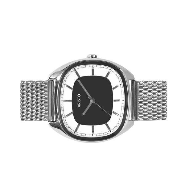 New from Aristo is this classic rectangular case dress watch. Very stylish and quite a departure from standard round watches, this model features a polished stainless steel case, Milanese bracelet and polished indices and hands. The dial is black.