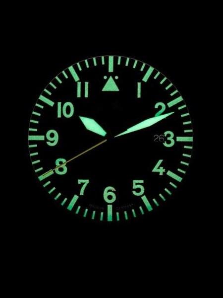 This Aristo 3H115A watch features a classic aviator dial design with easy to read hour and minute markers. The hands and markers are treated with SuperLuminova for an impressive glow-in-the-dark feature. An oversize, diamond cut crown makes for quick time adjustments even if you are wearing gloves. Turn the watch over and an exhibition back shows off the Swiss automatic movement. The 42mm case has a non-reflective satin finish, and with a case thickness of only 10mm it easily slides under your shirt cuff. Comes with a riveted leather strap.