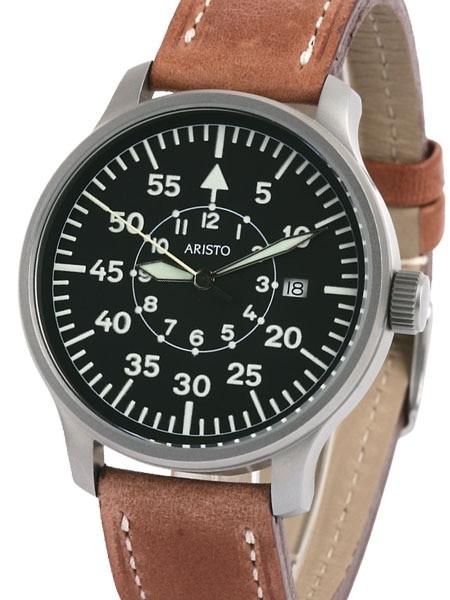 The Aristo 3H80 pilot watch features a Swiss Made Ronda 515 quartz movement, luminous hour and minute hands, a date window at 3:00, and a sandblasted case. Angled lugs help assure comfort on your wrist and a screw-in case back provides better water resistance and easier battery changes. The pilot style dial has luminous 60 minute markings on the outer dial and luminous hours on the inner dial. The SuperLuminova used on the hands and dial glows extremely bright in the dark. The watch is fitted with a thick, aviator style leather strap.