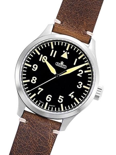 This Aristo 7H96 watch features a classic aviator dial design with vintage color luminous hour and minute markers (glows green in the dark). A Swiss ETA 2824-2 self-winding movement powers the watch (viewable via an exhibition window back). The 47mm stainless steel case has a brushed finish the crystal on the front of the watch is scratch resistant sapphire. A textured leather strap with tie-offs at the lugs gives the watch a great presentation on you wrist. Great vintage looking pilot watch.