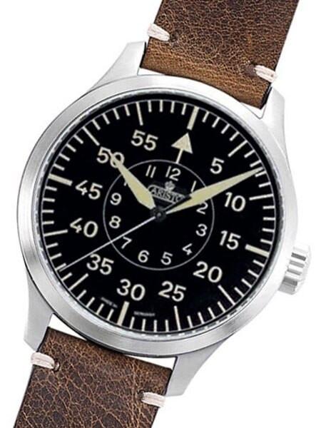 This Aristo 7H98 watch features a classic type B aviator dial design with vintage color luminous hour and minute markers (glows green in the dark). A Swiss ETA 2824-2 self-winding movement powers the watch (viewable via an exhibition window back). The 47mm stainless steel case has a brushed finish the crystal on the front of the watch is scratch resistant sapphire. A textured leather strap with tie-offs at the lugs gives the watch a great presentation on you wrist. Great vintage looking pilot watch.