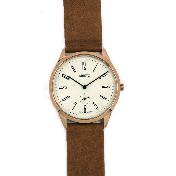 This Aristo watch is Made in Germany. It is powered by the Swiss made Ronda 1069 movement, and features a small seconds indicator at the bottom of the dial. The watch is done in the Bauhaus style, featuring simple stick hands and arabic numerals on the dial. The case and buckle are coated in a Rose gold plating. At just 7mm thick, it will easily fit under your shirt cuff.