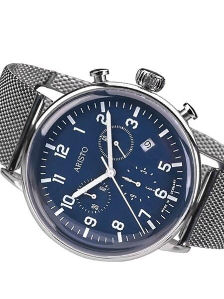 The new Aristo Bauhaus chronograph watch is based on the "3F" principle that was invented by Bauhaus designers in the 1920s: Form follows function. The model 4H161M features a blue dial with white Arabic hour numerals and sleek white hour and minute hands. The chronograph movement is a Ronda 5030 that has both a 30-minutes-counter and a 12-hours-counter (or totalizer). The 316L stainless steel case measures 42mm in diameter and just 12.5mm thick. A small date window is provided at the 4:00 position on the dial. A steel mesh bracelet completes the classy and dressy look. It is a very handsome watch.