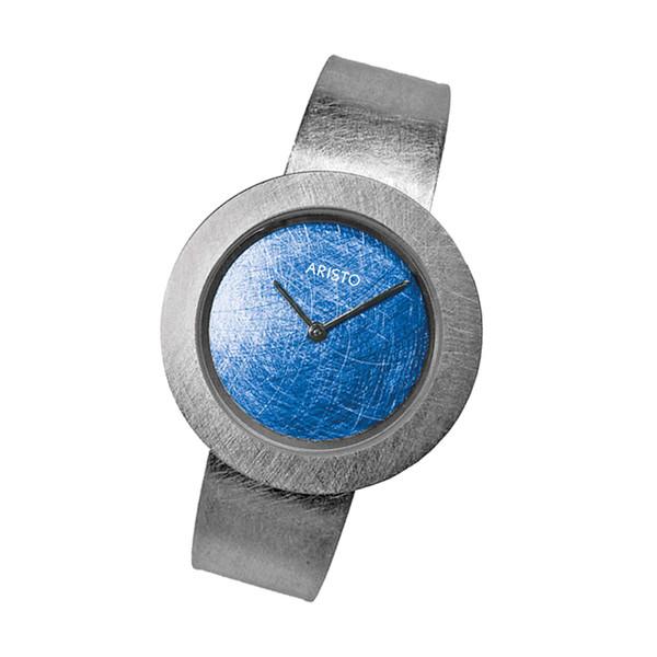 This titanium model from Aristo features a scratched dial, case and bangle bracelet. The blue dial has a fine appearance of lines on it, and it matches the distressed case and titanium bangle bracelet.