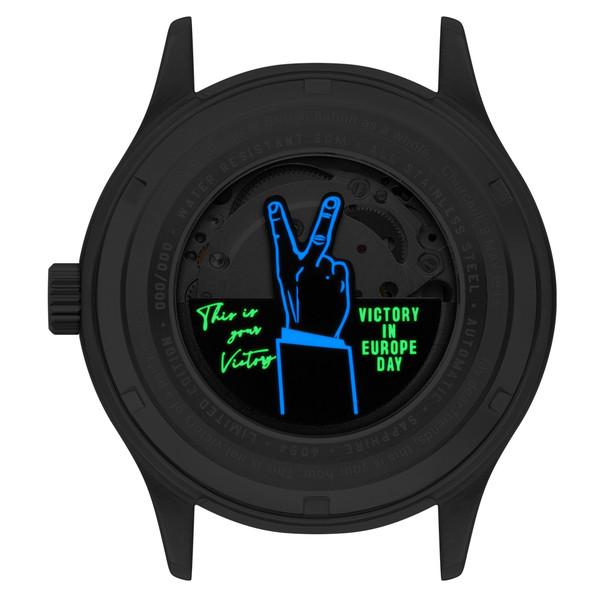 On the caseback, Winston Churchill’s VE-Day speech is engraved—a tribute to the resilience of a nation. His words, spoken in celebration, now stand as a timeless reminder of unity and triumph.