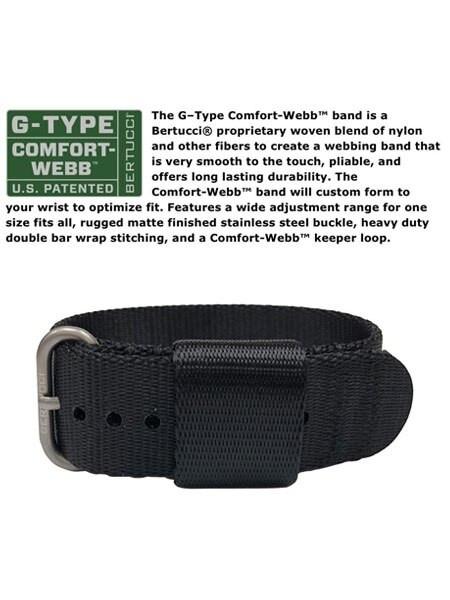 The G–Type Comfort-Webb™ band is a Bertucci® proprietary woven blend of nylon and other fibers to create a webbing band that is very smooth to the touch, pliable, and offers long lasting durability. The Comfort-Webb™ band will custom form to your wrist to optimize fit and comfort. Features a wide adjustment range for one size fits all, rugged matte finished stainless steel buckle, heavy duty double bar wrap stitching, and a Comfort-Webb™ keeper loop. It is a great all-around field watch.