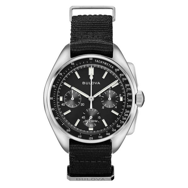 The Lunar Pilot chronograph features a 45mm stainless steel case with slim chronograph pushers and a crown featuring the Bulova tuning fork logo. The case features polished and brushed finishing and a flat sapphire crystal and is paired with a black nylon strap. The caseback is engraved with the tuning fork logo and the dates of the mission and landing.