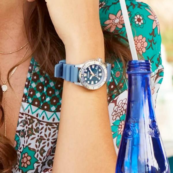 Submerge yourself in the latest Dive watch to join Citizen’s innovative Promaster line. The durable 37mm silver-tone stainless steel exterior comfortably fits wrists of all sizes, featuring an easy-grip uni-directional bezel and distinct crown at 4 o’clock. The monochromatic design is secured to the wrist via a teal polyurethane strap.