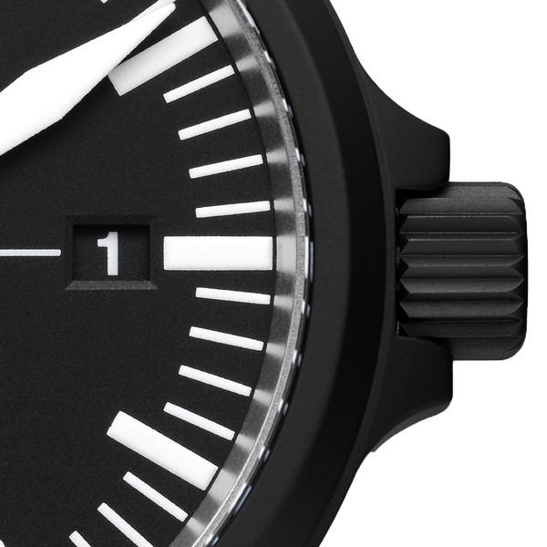 The 39mm diameter case is made from surfaced hardened, submarine steel that is bead blasted to produce a non-reflective matte finish. It is finsihed with a very hard DAMEST coating. Overall height is 9.95mm. Lug width is 20mm. Weight without strap is 57 grams. The crown screws-down via the “DAMASKO System” to achieve a water resistance rating of 20 bar or 200 meters. A rubber "max sport" strap secures the DK32 to your wrist.
