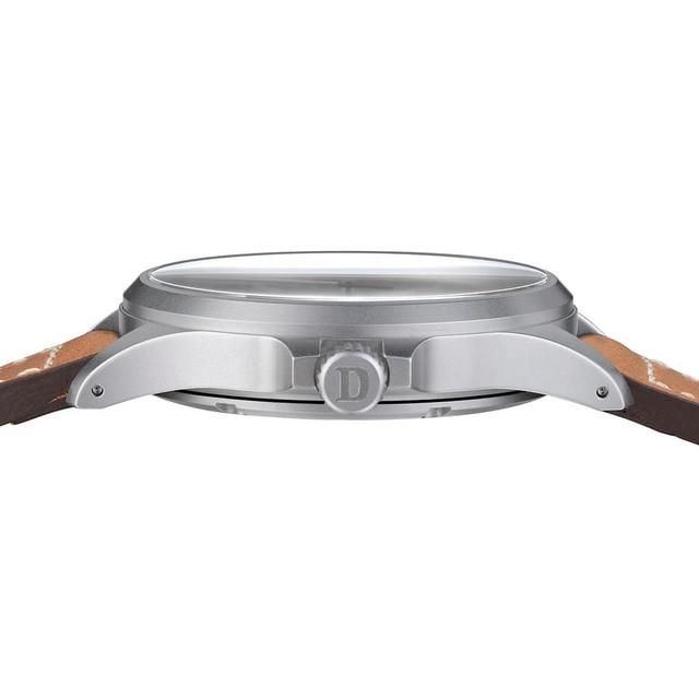 The 39mm diameter case is made from surfaced hardened, submarine steel that is bead blasted to produce a non-reflective matte finish. Overall height is 9.95mm. Lug width is 20mm. Weight without strap is 57 grams. The crown screws-down via the “DAMASKO System” to achieve a water resistance rating of 20 bar or 200 meters. A vintage-style leather strap with contrasting tie-off stitching secures the DK32 to your wrist.