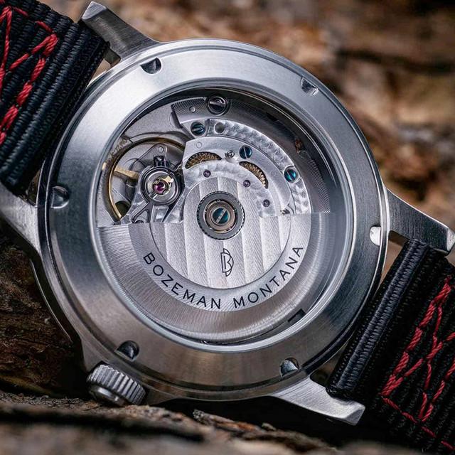Utility aside, we have added a few unique features to the Field Watch that bring an additional layer of personality to the timepiece. We have included an observation case-back that allows for a clear view of the decorated movement, and a red "45" minute indicator marked on the dial. The red forty-five minute indicator is in reference to the latitude of Bozeman, MT, which is approximately forty-five degrees North on the latitudinal plane.