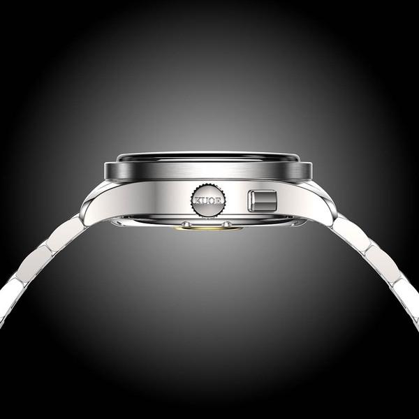 For the first time, KUOE has adopted CITIZEN MIYOTA's premium Japanese-made "Cal. 9122" movement. This high-beat movement features a triple calendar function with support for the date, day of the week, and month. The dial for this model is what is often referred to as a "panda dial." The dial itself is ivory, while the subdials are black, reminiscent of a panda's face. The dial itself has a subdued grain texture. The crystal is a boxed dome sapphire glass with AR coating. The Arabic numerals on the dial are classic Breguet numerals, reminiscent of antique watches of yesteryear. The indices on the outer circumference are raised, adding depth to the dial's appearance.