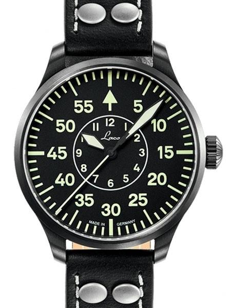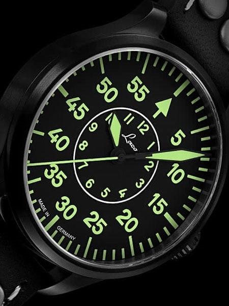 The Laco Bielefeld (model 861992) model features a 39mm black PVD stainless steel case and a scratch resistant sapphire crystal. The 39mm case design houses a Laco 21 automatic (self-winding) movement. The Altenburg model has a black Type-B pilot dial with large minutes and small hours. The hands and dial markers are treated with SuperLuminova for excellent readability in the dark. Like the original WWII Laco watches, there is no date window. Includes a really nice black leather strap with rivets like those used in WWII.