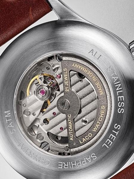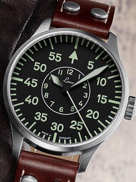 The new version of the Laco Aachen 861690 model now features a scratch resistant sapphire crystal (only a diamond can scratch it). The 42mm case design houses a Laco 21 automatic (self-winding) movement. The Aachen model has a black Type B (or bomber) dial with large minutes. The hands and dial markers are treated with SuperLuminova for excellent readability in the dark. Like the original WWII Laco watches, there is no date window. Includes a really nice brown leather strap with rivets like those used in WWII.