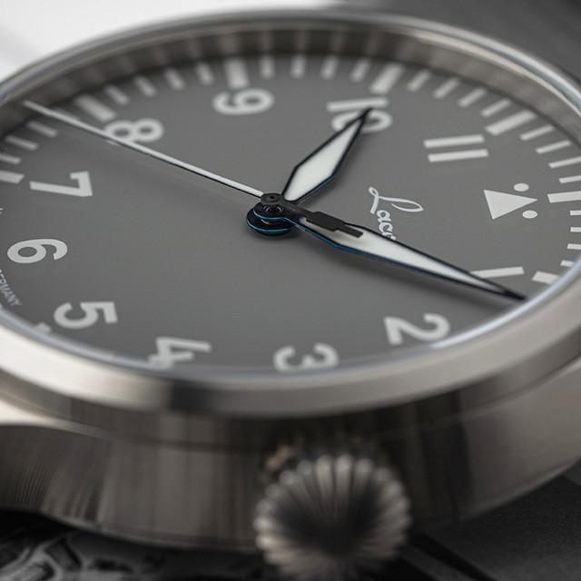 The new version of the Laco Augsburg model has a beautiful matte gray dial. It also features a scratch resistant sapphire crystal. The 42mm case design houses a Laco 2S automatic (self-winding) movement. The Augsburg model has a Type A (or pilot) dial with large hours. The hands and dial markers are treated with Super-LumiNova for excellent readability in the dark. Like the original WWII Laco watches, there is no date window. Includes a really nice gray leather strap with rivets like those used in WWII.
