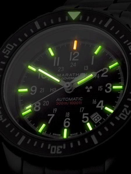 Tritium gas filled tubes provide the illumination sources to ensure constant visibility of the time in low light situations. Glass tubes are placed by hand on each hour marker and on each hand. Tritium tubes are self-illuminating gas tubes which contain an isotope of hydrogen, meaning they will not dull down in brightness like normal photo-luminescent paint which requires an external light source to create a glow. The 12 hour bezel marker is made of MaraGlo which needs to be charged by light to glow.