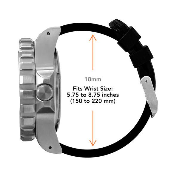 Features a 3 Piece Rubber Strap System (made in La Chaux-de-Fonds, Switzerland) crafted from FKM Rubber to meet the requirements of high-performance military applications. The 3-Piece system comes with one (6 o'clock) tail piece with 8 adjustment holes, and two (12 o'clock) buckle pieces of different sizing that allow the wearer to tailor the length to fit their wrist size.
