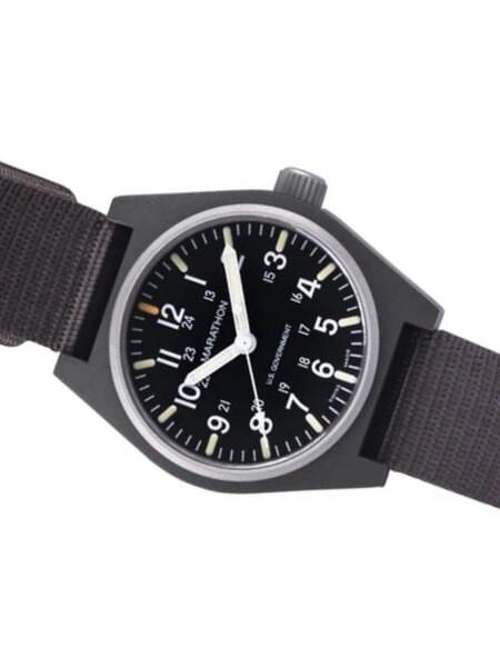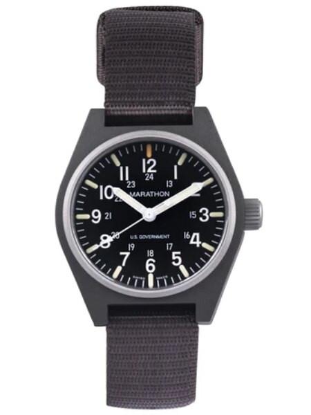 Developed by Marathon Watch Company as a field watch to be issued to military personnel, the General Purpose Quartz is a watch that meets all the requirements of a true military field watch. Made from a highly durable, impact resistant fibershell case that is water resistant to 3 atmospheres (30 meters - 100 feet), sweat resistant and will not yield to the elements. The fibershell case of the General Purpose Quartz is also a passive matte finish, as to not give away infantry position through reflections, which would occur on a normal metal case. Fibershell also is an extremely lightweight material, an important factor on the battlefield where every ounce counts. The General Purpose Quartz now comes with a scratch-resistant sapphire crystal. The back of the watch is made of 316L surgical stainless steel, a steel with low carbon content that will not corrode over time.