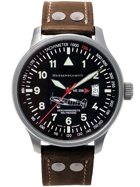 This beautiful timepiece from Aristo pays tribute to the legendary Messerschmitt airplane of 1938. The ME-209 was a single engine aircraft developed as a pure record breaker airplane. In 1939 Messerchmitt test pilot Fritz Wendel achieved the speed record of 755 km/hr. This record was not officially broken by another piston-engined aircraft until August 1969. To commemorate this historical event the watch features on the dial the numbers 755 in red on the tachymeter scale.