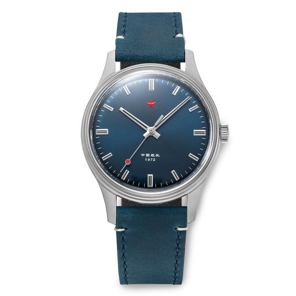 Here is quite a simple offering from Red Star watches. This 3-hand dress watch features a replica handwind Tongji (unified) mechanical movement. It has 17 jewels and a power reserve of about 36 hours. The Blue dial is adorned with the Red Star logo and faceted indices are used for the markers. "1972" is marked on the dial, denoting a time when Chinese watchmaking was at the top of its game.